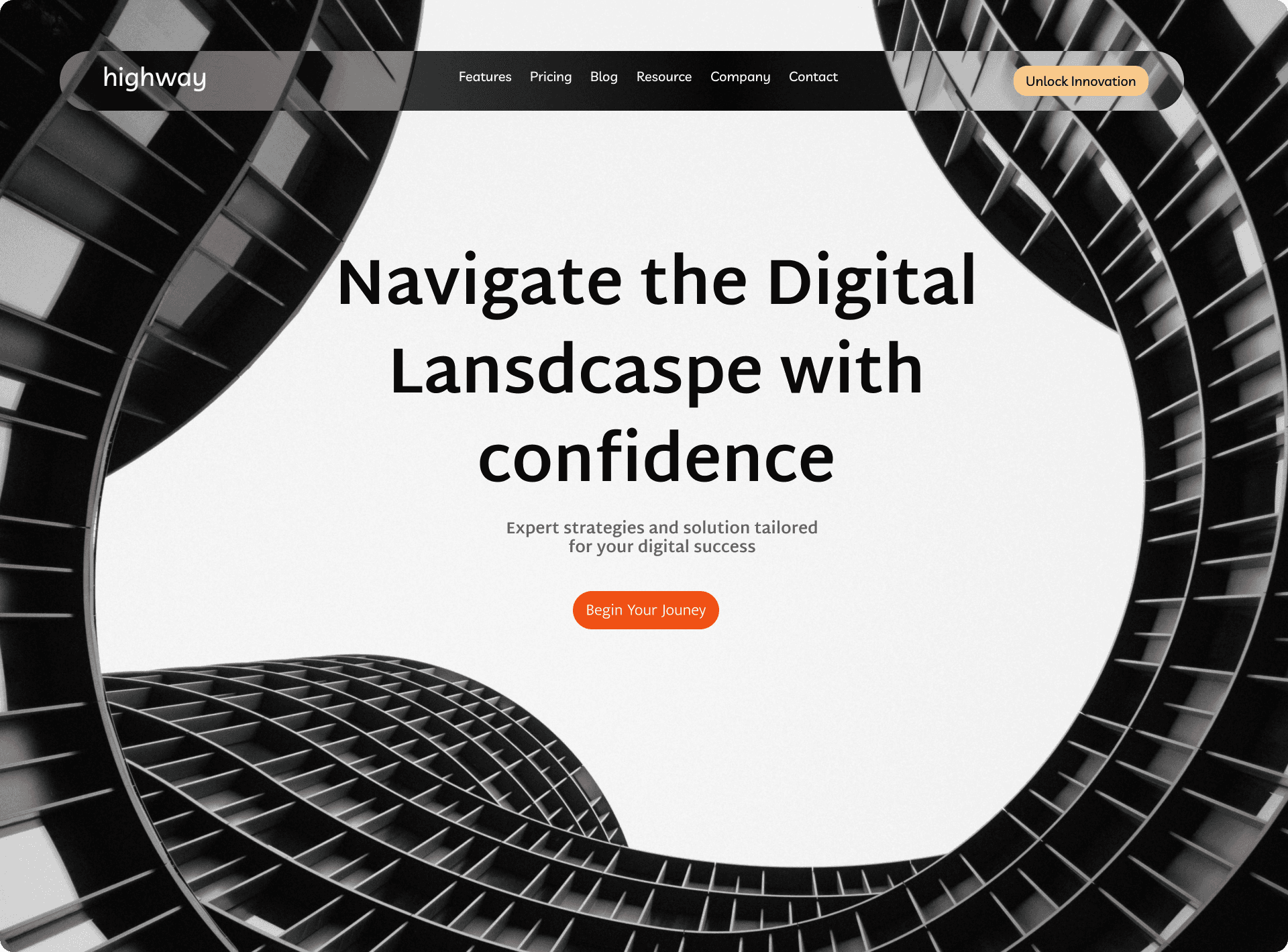 Typography: The main headline, "Navigate the Digital Lansdcape with confidence," uses a bold, sans-serif font that is highly legible. The sub-headline, "Expert strategies and solution tailored for your digital success," is in a smaller, lighter weight font, providing a clear visual hierarchy. This distinction guides the user's eye from the main message to the supporting detail.